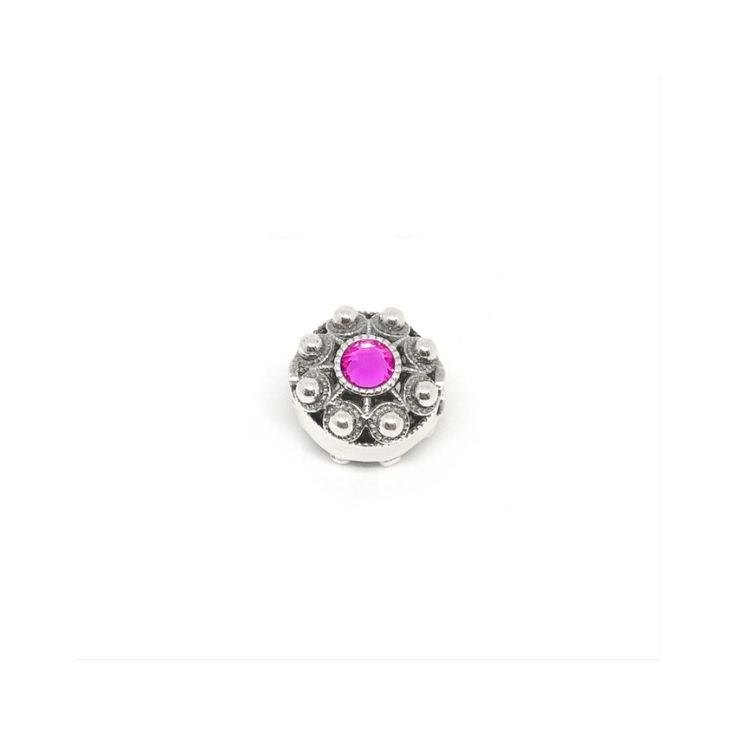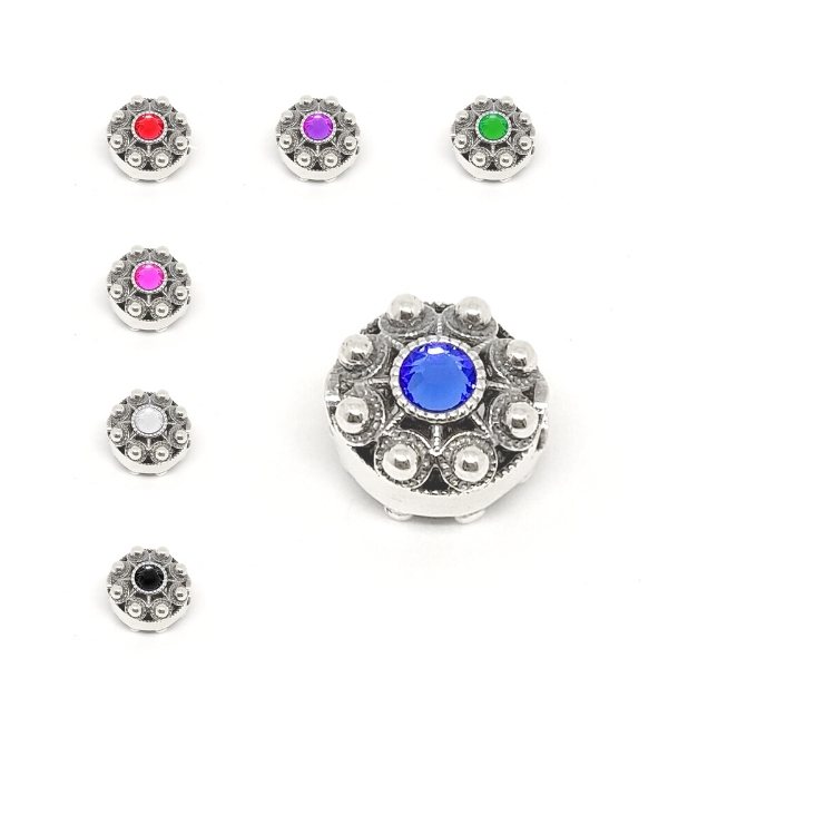 Además, cada abalorio se distingue por su composición de dos botones charros de plata de ley, adornados con un cristal de color en su centro. Estos elementos están cuidadosamente soldados a una lámina de plata de ley, lo que les confiere una resistencia excepcional al desgaste. Sus dimensiones, Diámetro del botón: 13 mm; Alto: 9 mm, lo hacen perfecto para cualquier ocasión.