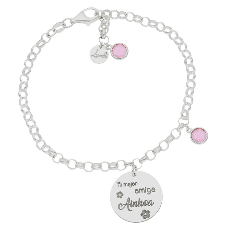 Bonita pulsera con frase Mi Mejor amiga junto a una piedra de color rosa. Es la pulsera perfecta para regalar a tu amiga por su cumpleaños o en una fecha importante para los dos. Será una original forma de demostrarle tu amistad.