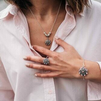 Combina esta sortija con tus prendas de color favorito ya que con la llegada del buen tiempo apetece lucir colores. Y ya de puestos ¿por qué no combinarlo con unos pendientes, gargantilla y pulsera a juego?