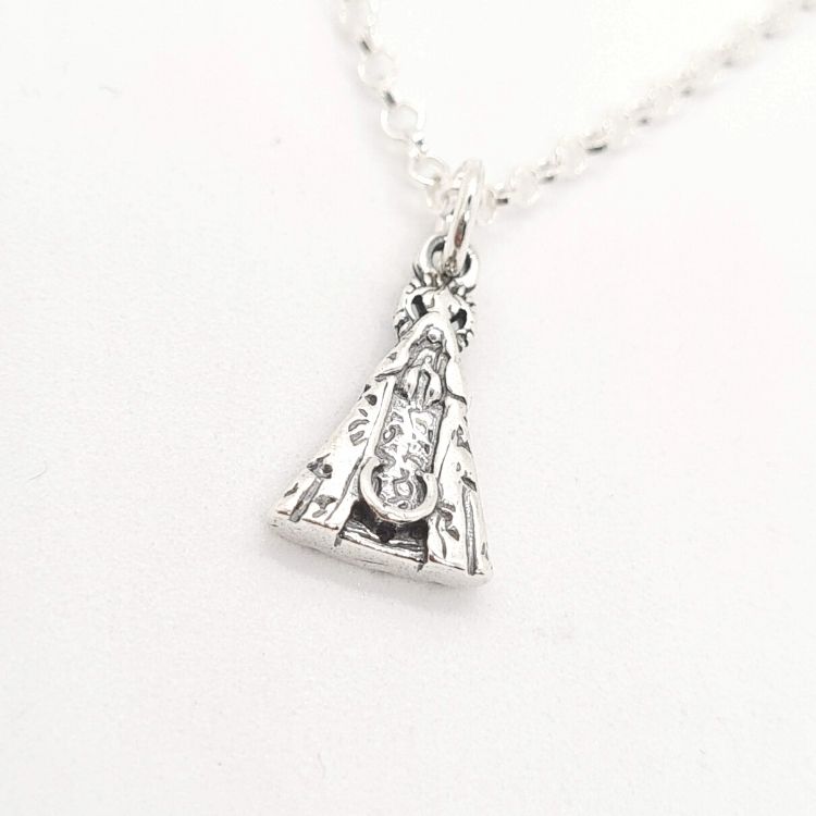Muestra la imagen de Nuestra Señora del Socorro de una manera minimalista, en el que a pesar de su tamaño se pueden apreciar las características y silueta de la Virgen del Socorro, patrona de Vitigudino.