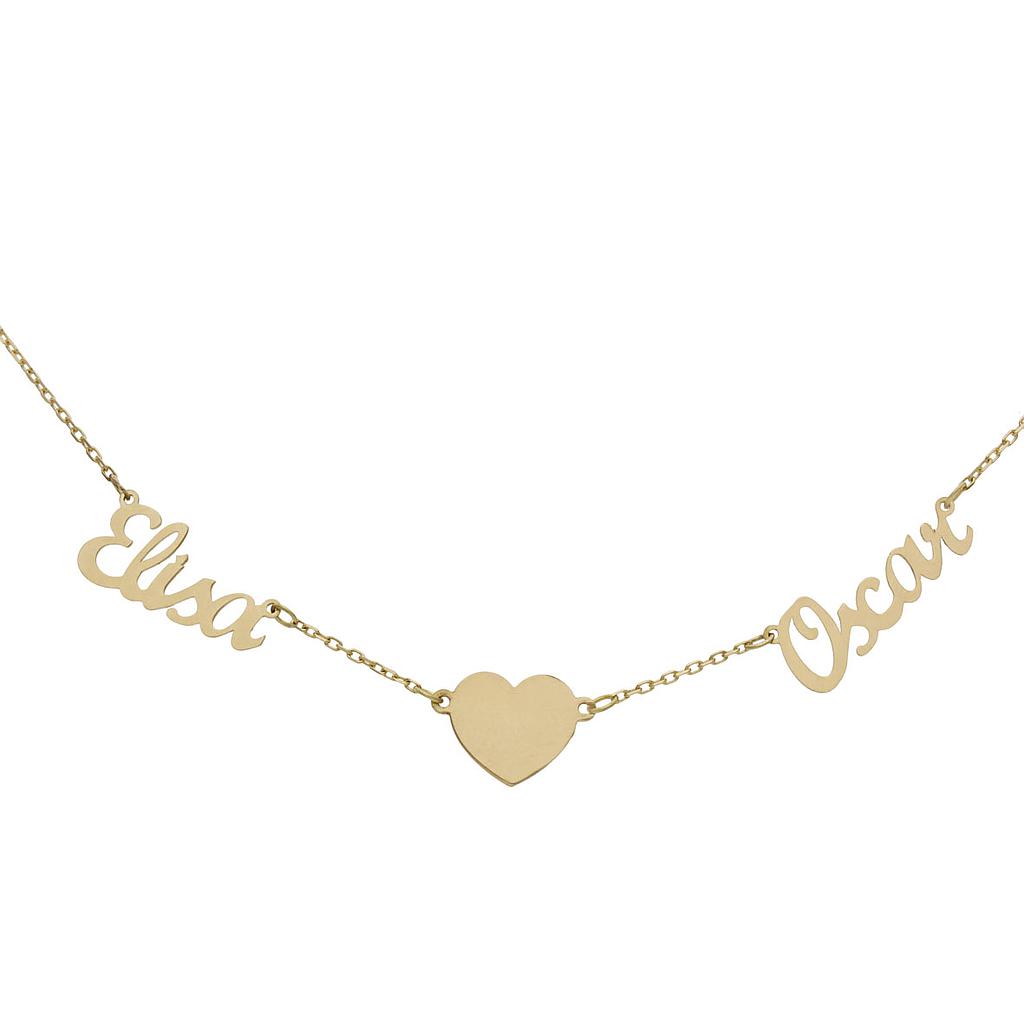 Precioso colgante personalizable con dos nombres y en el medio lleva un corazón, simbolizando el amor que sientes hacia esas personas. Es ideal para poner el nombre de tus hijos, padres, pareja…
