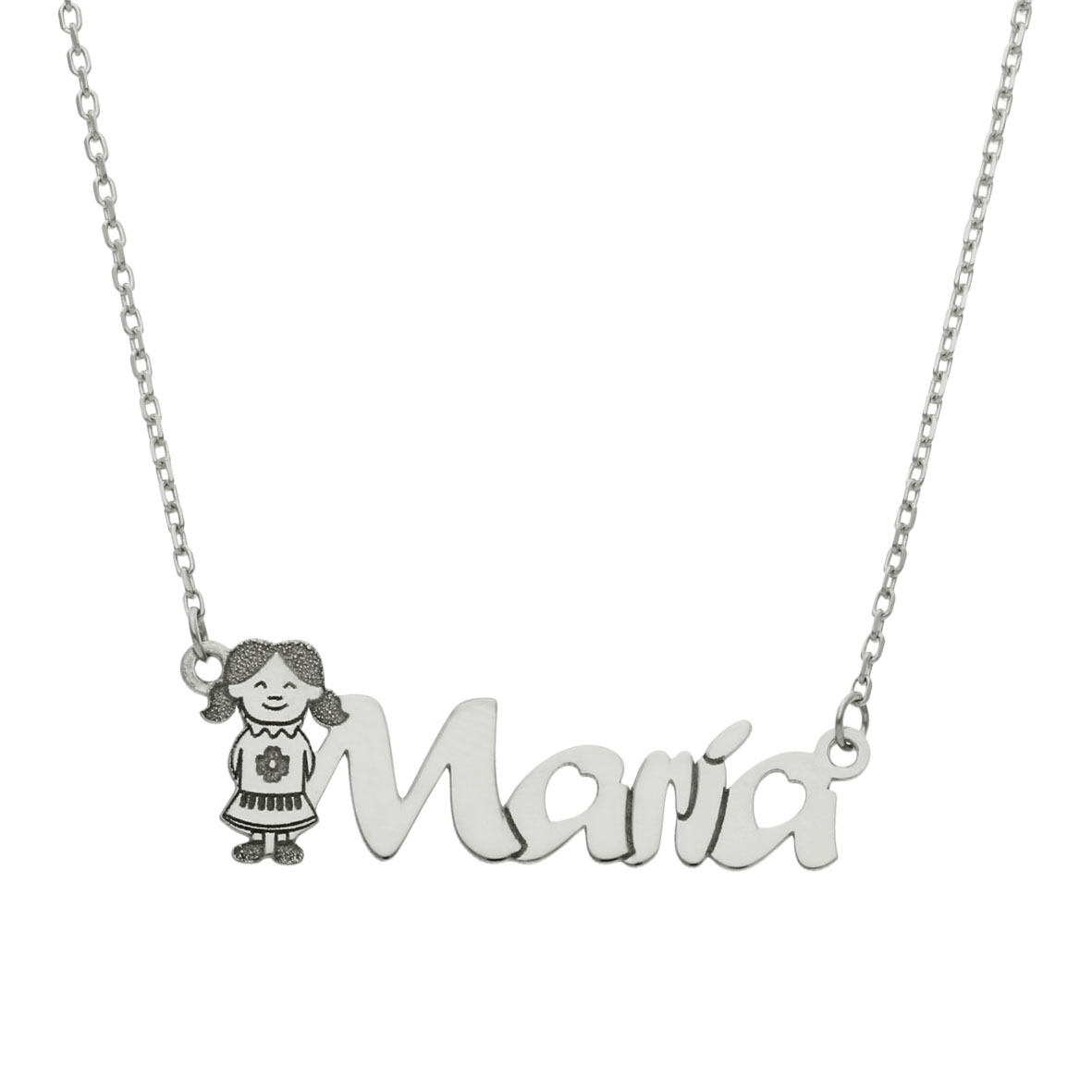 Si estas buscando un colgante con tu nombre, esta joya personalizada es ideal, porque junto al nombre que desees irá un muñequito de una niña, que le da un toque original al colgante. Es perfecto para poner el nombre de tu hija, nieta o sobrina o para hacer un regalo a tu hija por el día de su comunión o un cumpleaños. Lo tenemos en tres materiales, oro, oro blanco y plata.