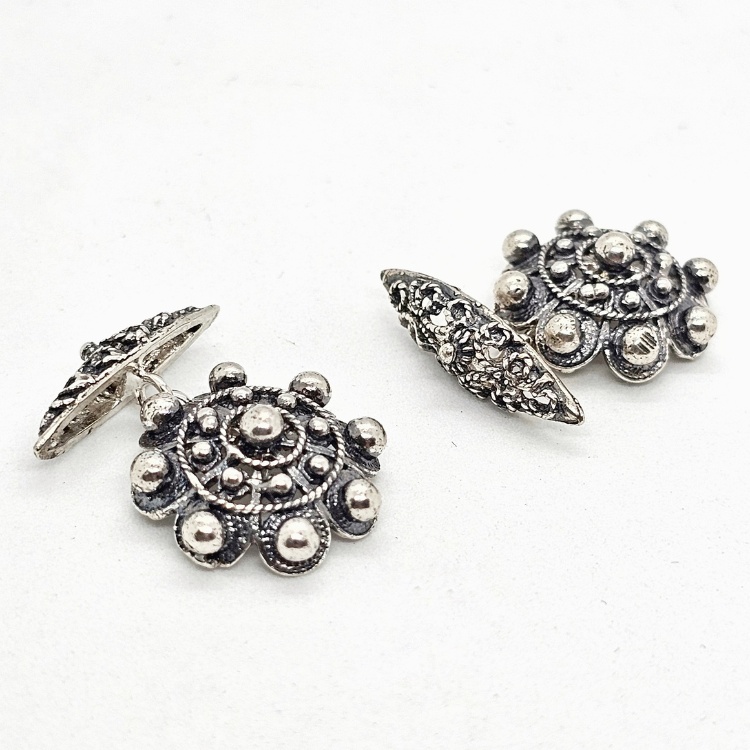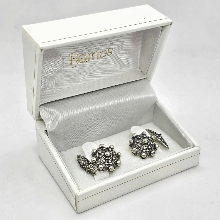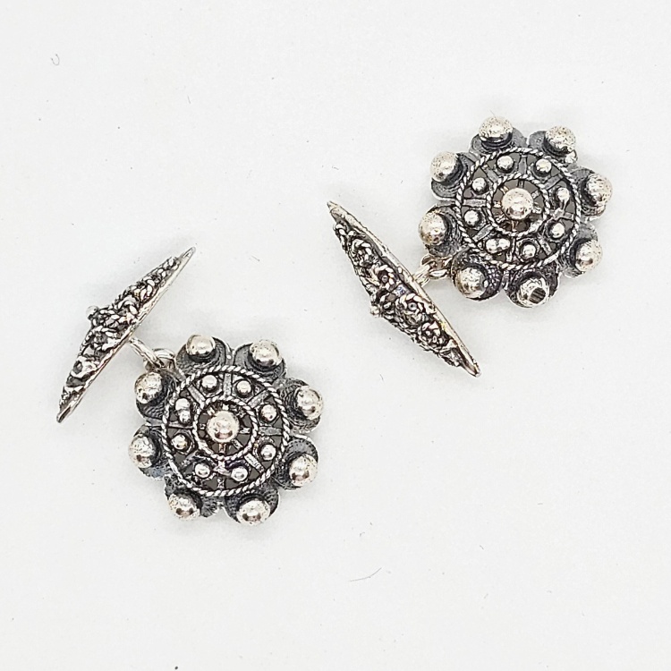 Gemelos de Botón charro con “ballestilla” de filigrana charra unidos por cadena todo en plata de ley