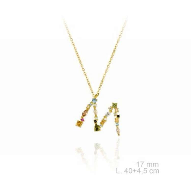 Colgante letra grande en plata de ley chapada en oro con piedras multicolor engarzadas.