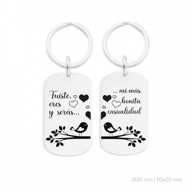 Pareja de llaveros de acero con la frase compartida: fuiste eres y serás mi más bonita casualidad.
