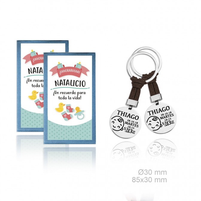 Llaveros de acero rodiado personalizables con el nombre, día, hora y fecha de nacimiento, peso y estatura del bebé.