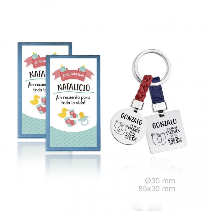 Llaveros de acero rodiado personalizables con el nombre, día, hora y fecha de nacimiento, peso y estatura del bebé.
