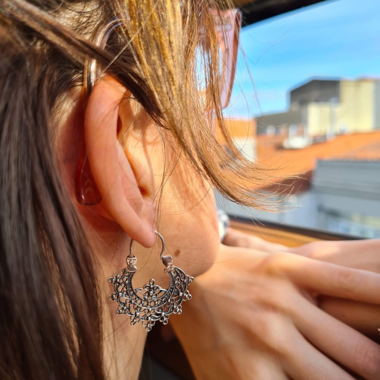 Pendientes aro tipo criolla de filigrana charra en plata 925mm oxidada con aspecto antiguo.