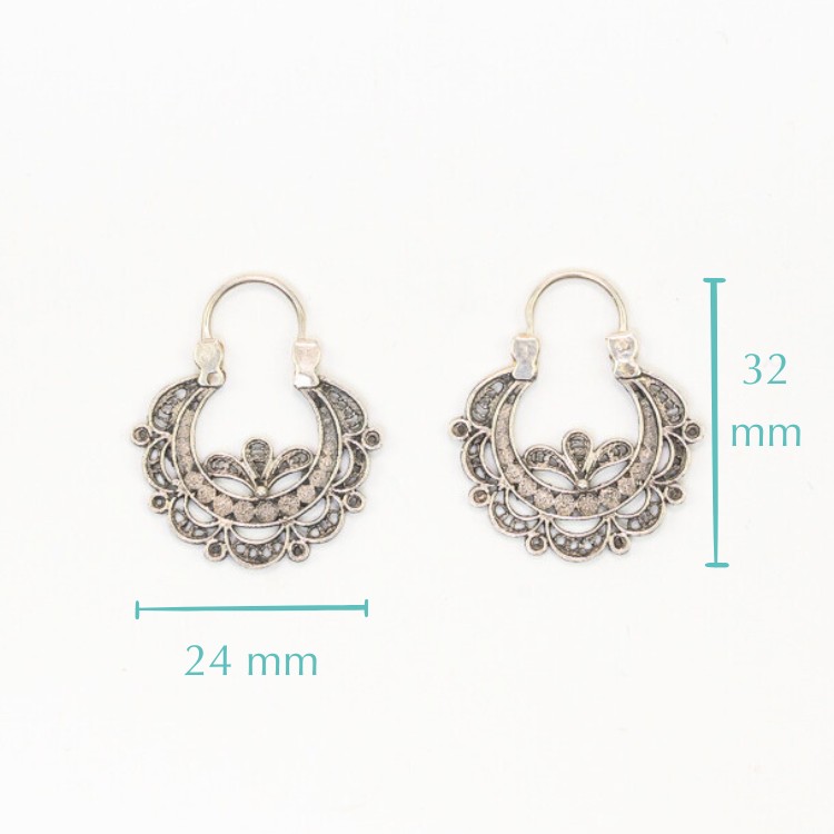 Pendientes, aros de filigrana en plata de ley oxidada con aspecto antiguo.
