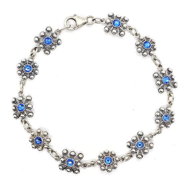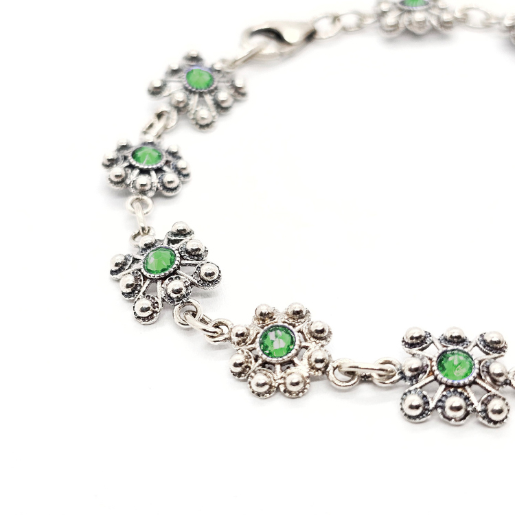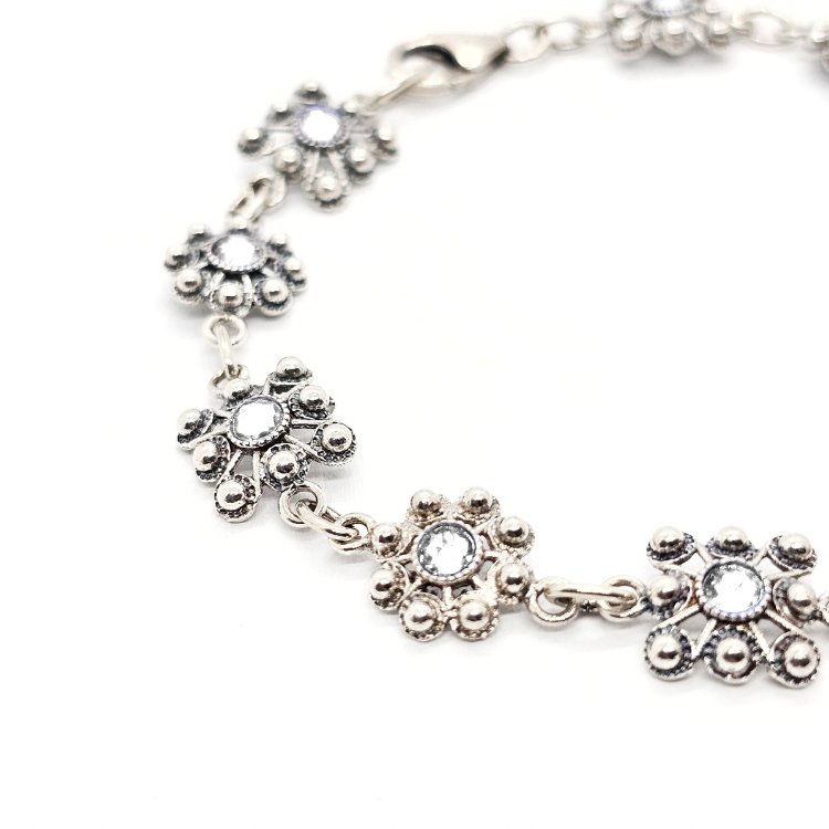 Cada elemento de esta pulsera ha sido cuidadosamente elegido. Alternamos 11 botones charros en plata de ley, con diseños tanto redondos como cuadrados de 8 mm. Además, personalizamos cada pieza con cristales de colores vivos. Tienes opciones como el azul, que recuerda el cielo de Salamanca, y el verde olivina, que evoca sus paisajes. Otros colores como fucsia, morado y rojo, añaden vibración y vida a la pieza.